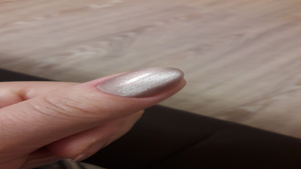 Цвет: Холодный темный бежевый с красно-оранжевым эффектом аврора, мелким светоотражающим глиттером и ярким серебристо-белым магнитным бликом