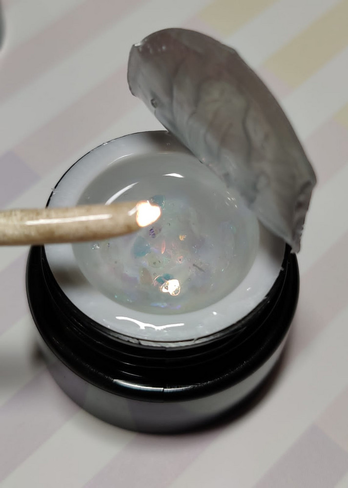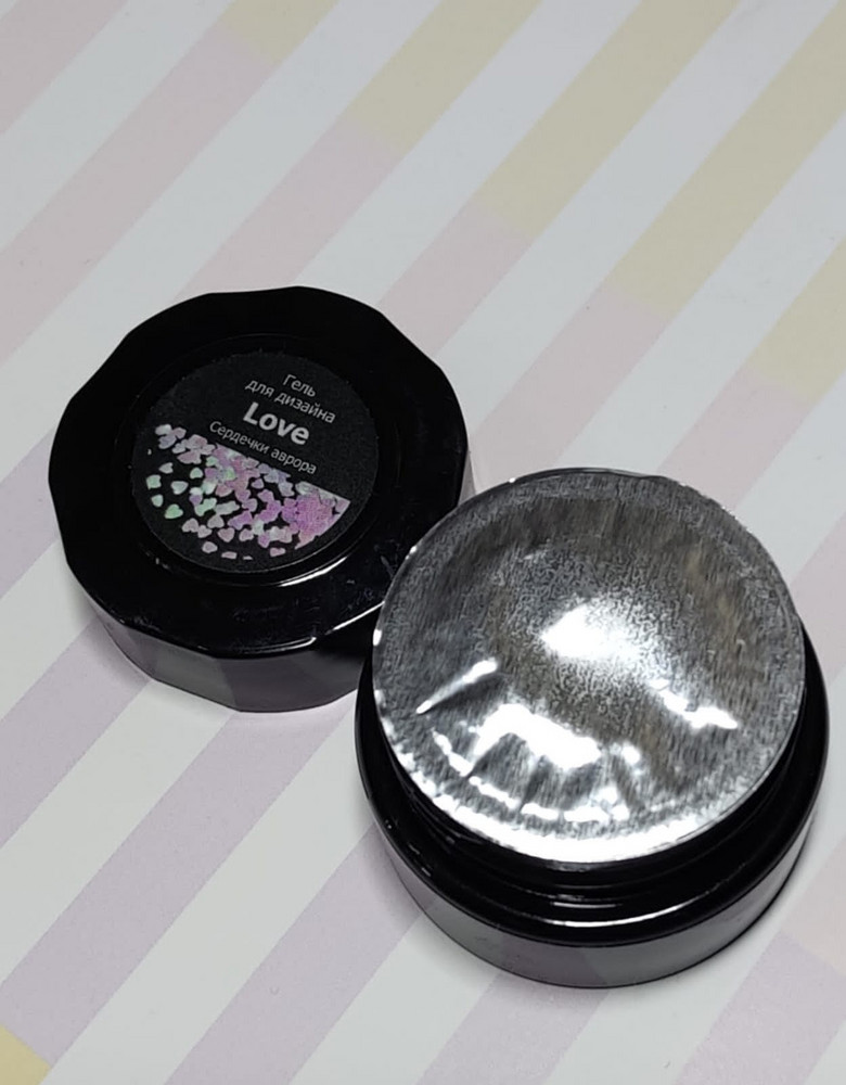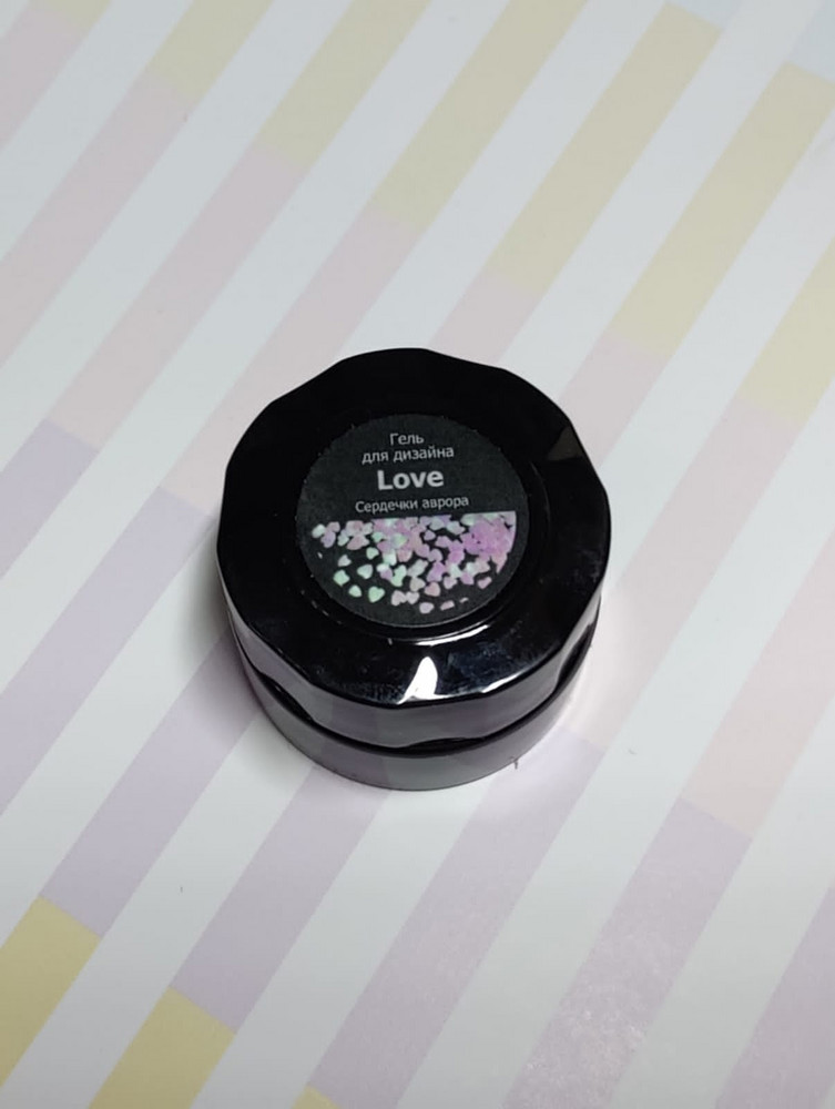 Очень прикольная штука для дизайна! Гель в меру вязкий, самовыравнивается Сердечки полупрозрачные, под разным углом зрения переливаются разными цветами. Перед использованием надо перемешать.