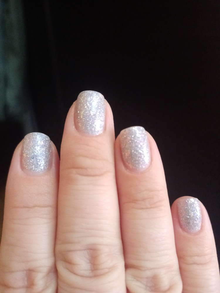 Лак очень красивый, именно этот цвет можно положить на любой цветной лак, и вы получите каждый раз новый цвет. Но так как блёстки крупные, ноготь получается шершавый. После высыхания надо обработать бафом и покрыть прозрачным лаком. Будет отличный результат.