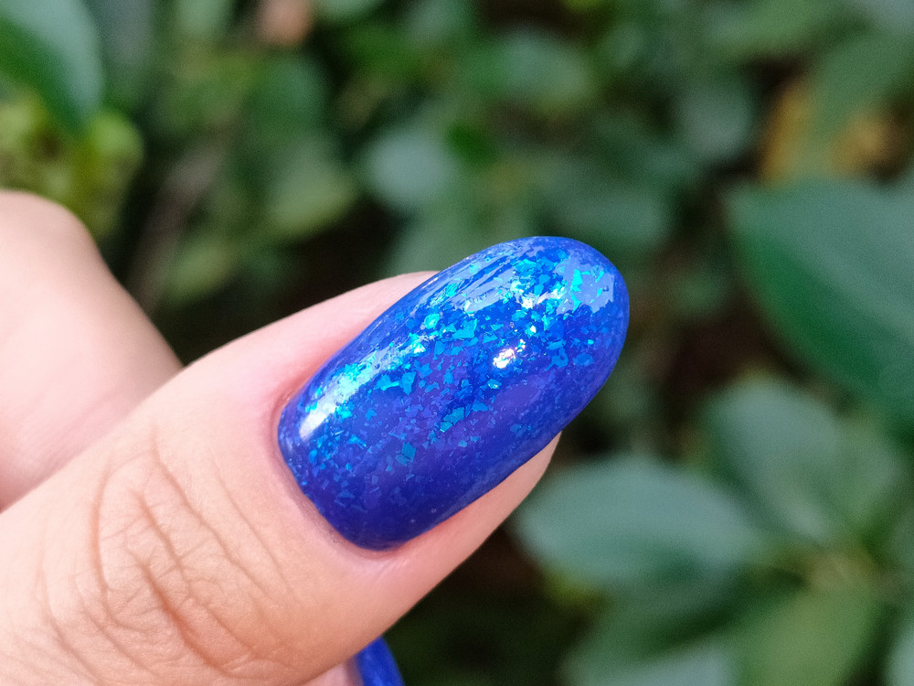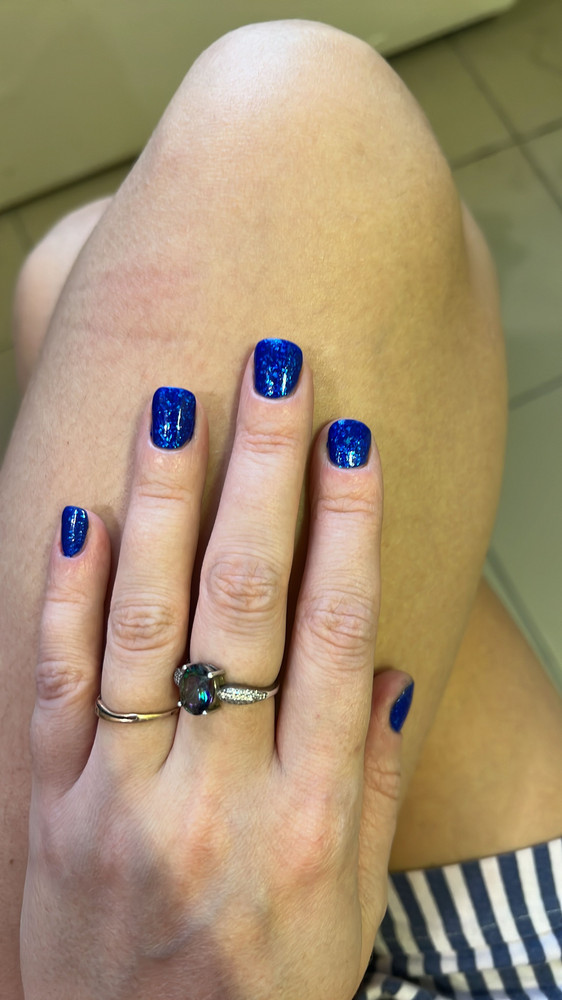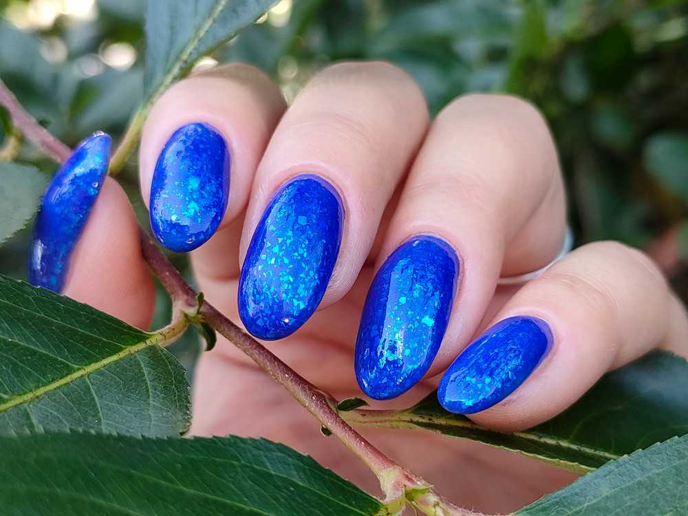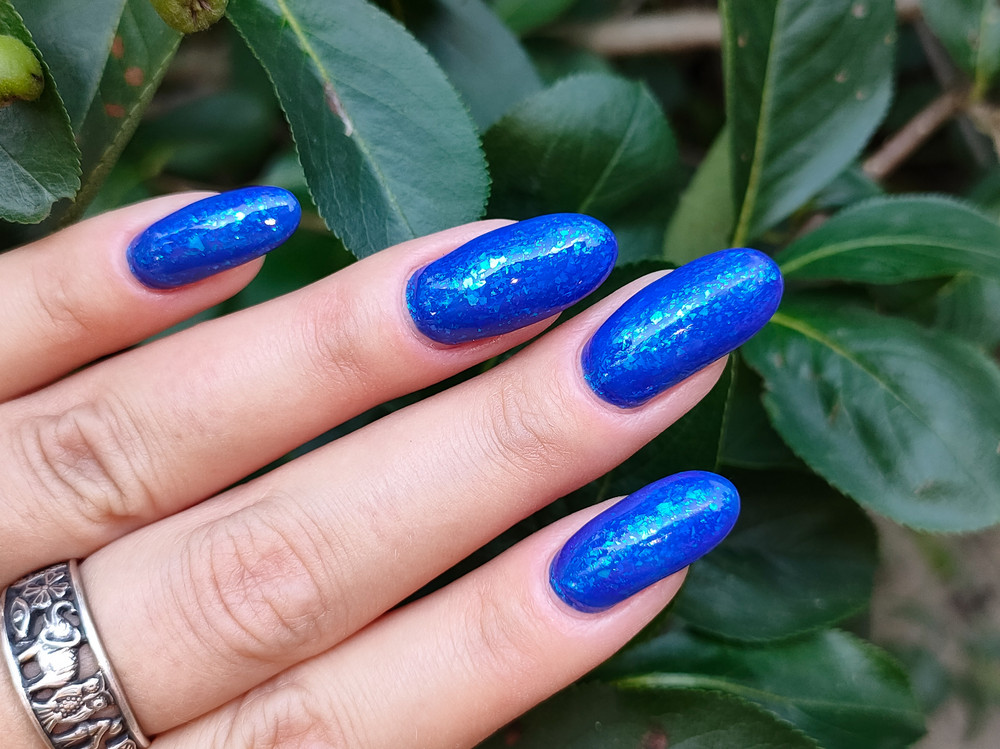 Цвет: Глубокое ярко-синее желе с мультихромной слюдой (зеленый, голубой и синий переливы)