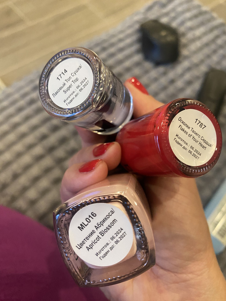 На фото неделя носки, готовку уборку пережил лак норм. Сверху покрывала сушкой этого же бренда. Рекомендую. Ложится норм, сохнет тоже. На два раза плюс сушка