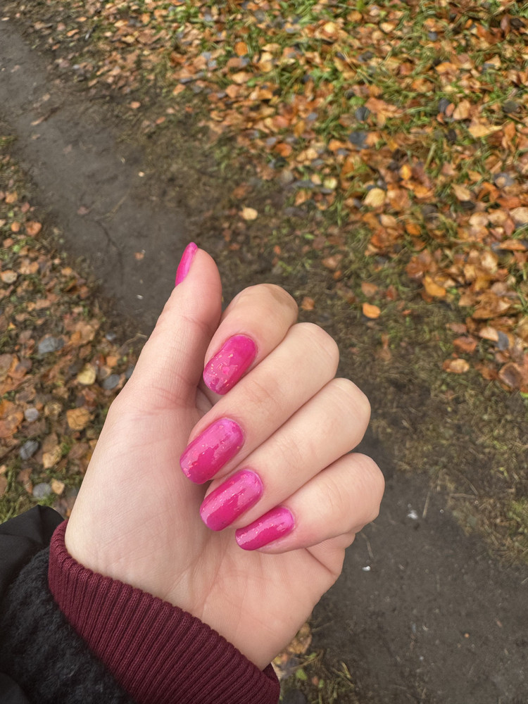 Заказывала два лака. Нюдовый носила неделю, первые сколы пошли после применения бытовой химии. Мне понравилось. Наносила в 3 слоя. Малиновый, кисельный, немного не зашел цвет. Отвыкла от такого яркого цвета. Из-за этого немного ощущаю дискомфорт. В целом, мне нравится. Малиновый тоже в три слоя. Кдинственное, такой яркий лак мне только на коротких ногтях нравится)