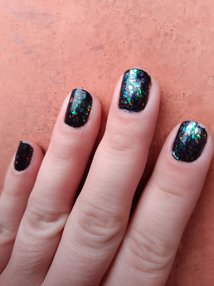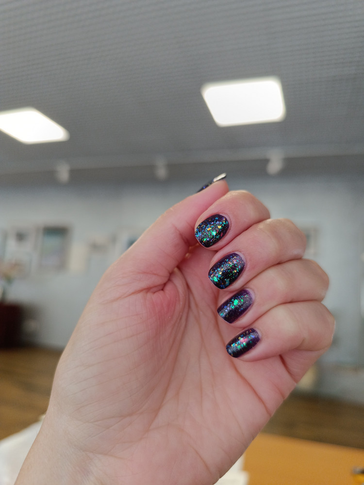 Наносила на черный лак в два слоя топ со слюдой и сушку сверху.