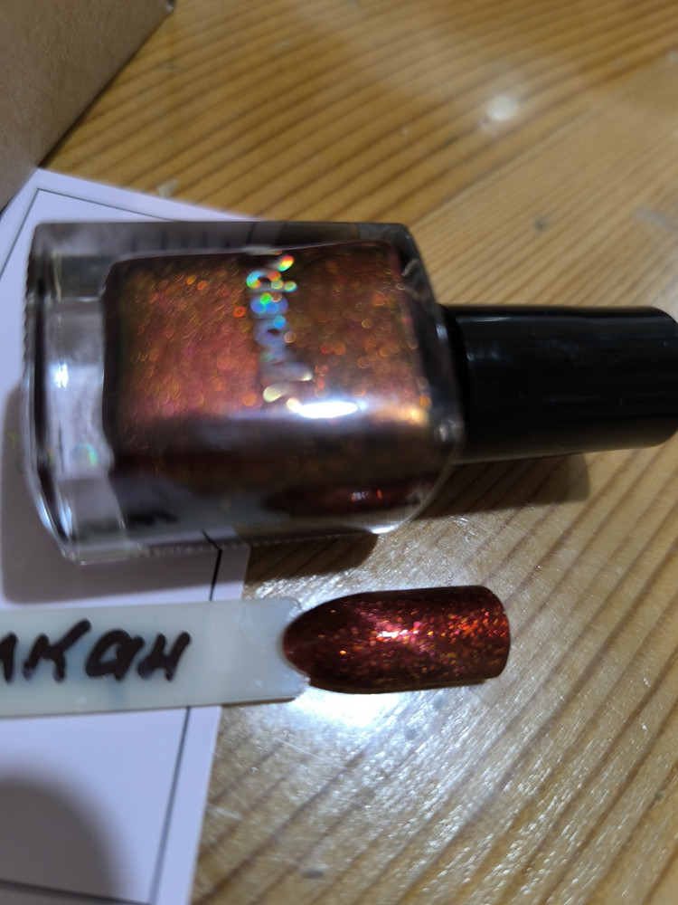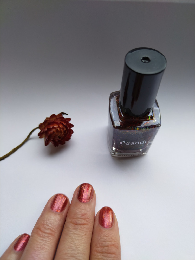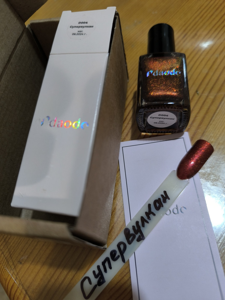 Магнитный лак daodo «Супервулкан» - в глубокой темной бордово-коричневой базе два вида слюды: мультихромная золотисто-бронзовая и мультихромная красно-золотая, а также яркий красно-янтарный магнитный блик.
