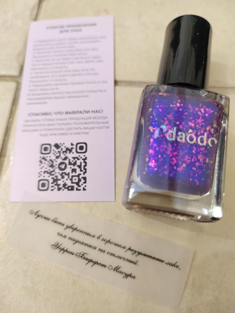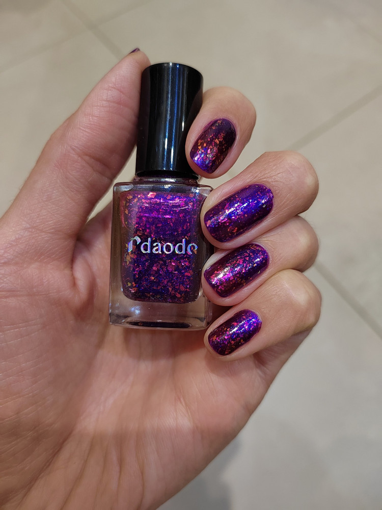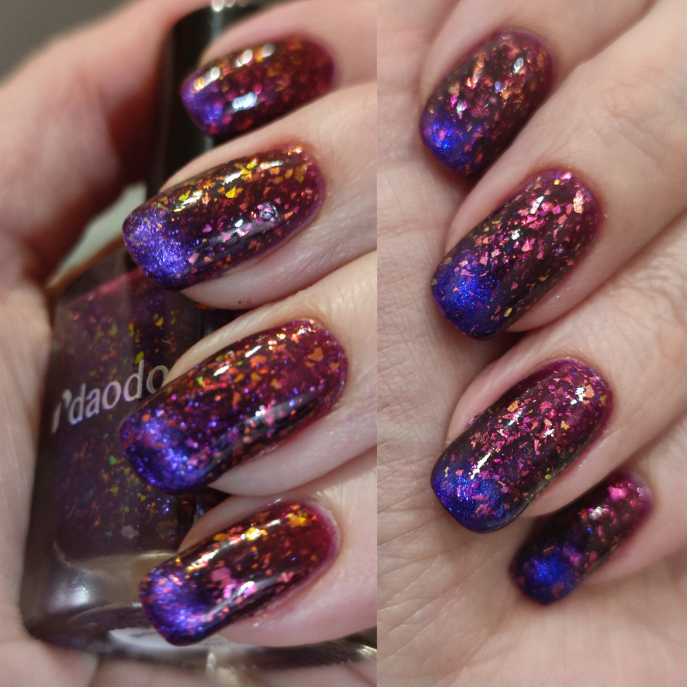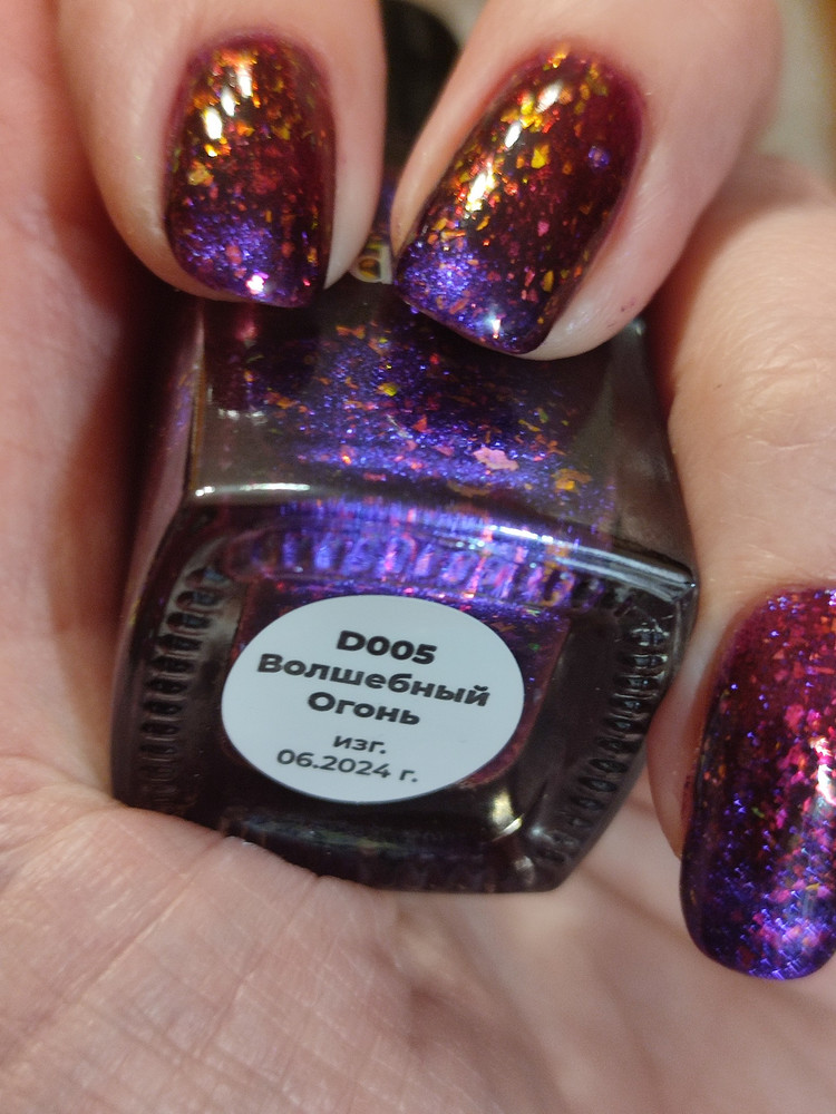 Магнитный лак daodo «Волшебный Огонь» - сочный фиолетовый с мультихромной слюдой двух видов: розово-оранжевой и зелено-голубой, а также с ярким синим магнитным бликом.