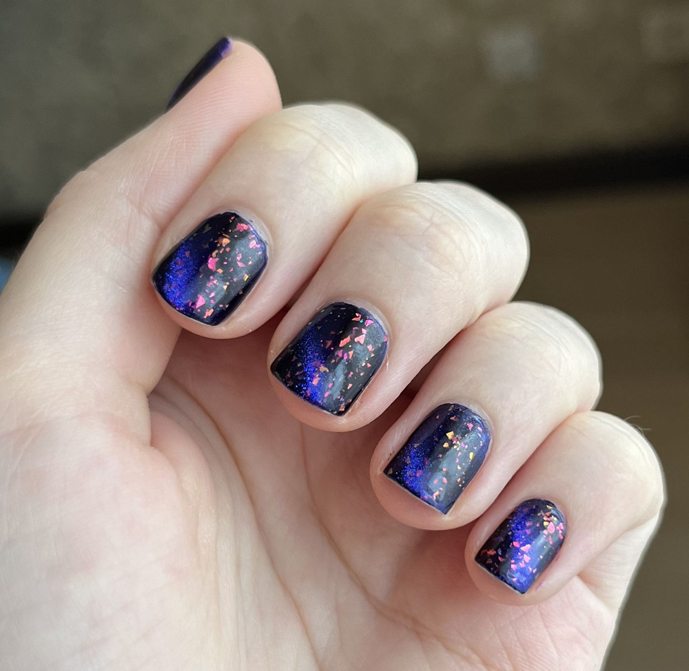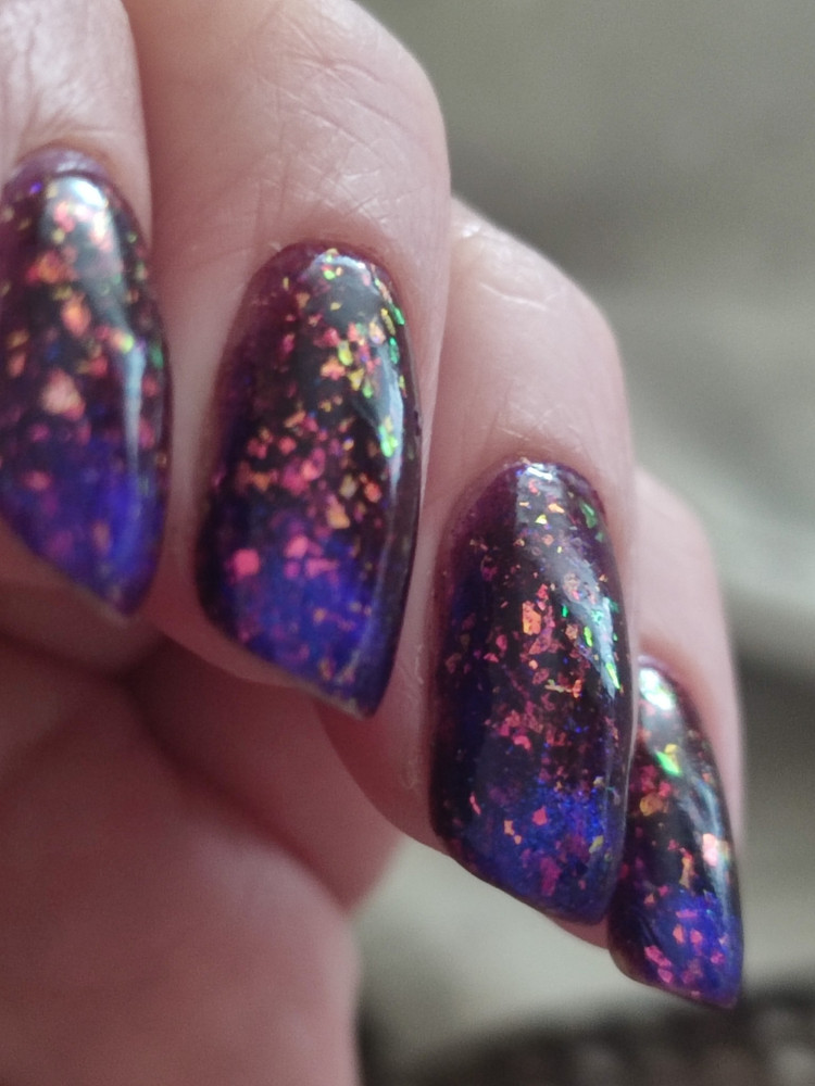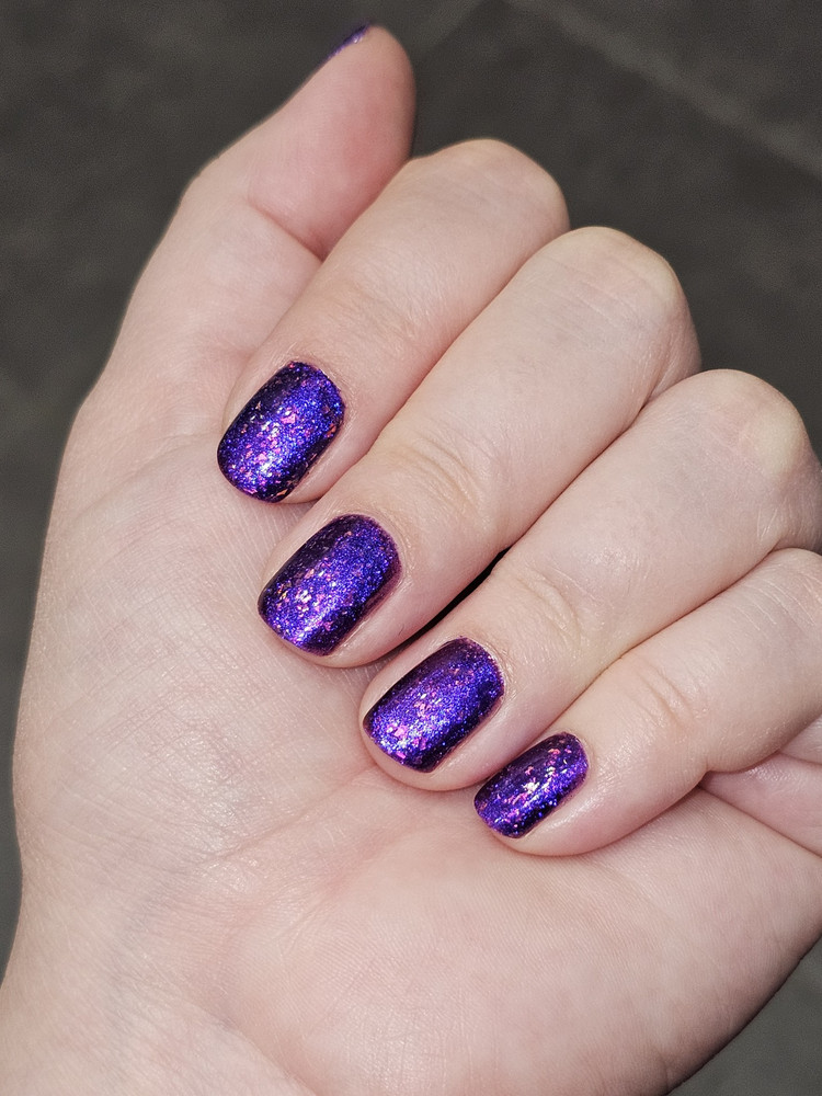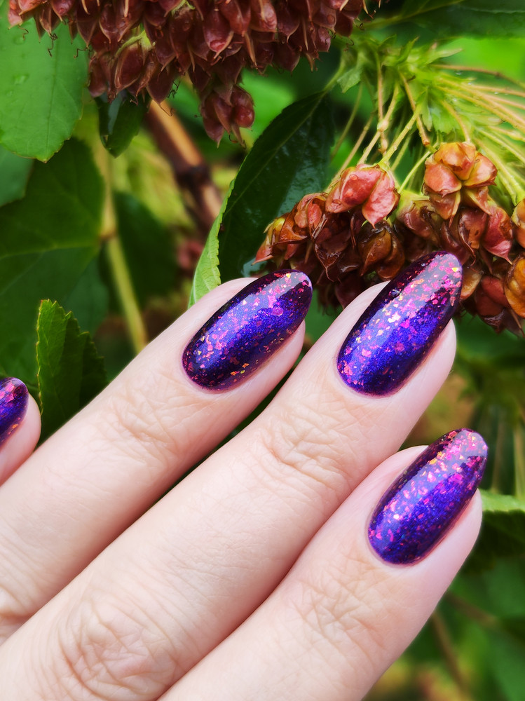 Цвет: Сочный фиолетовый с мультихромной слюдой двух видов: розово-оранжевой и зелено-голубой, а также с ярким синим магнитным бликом