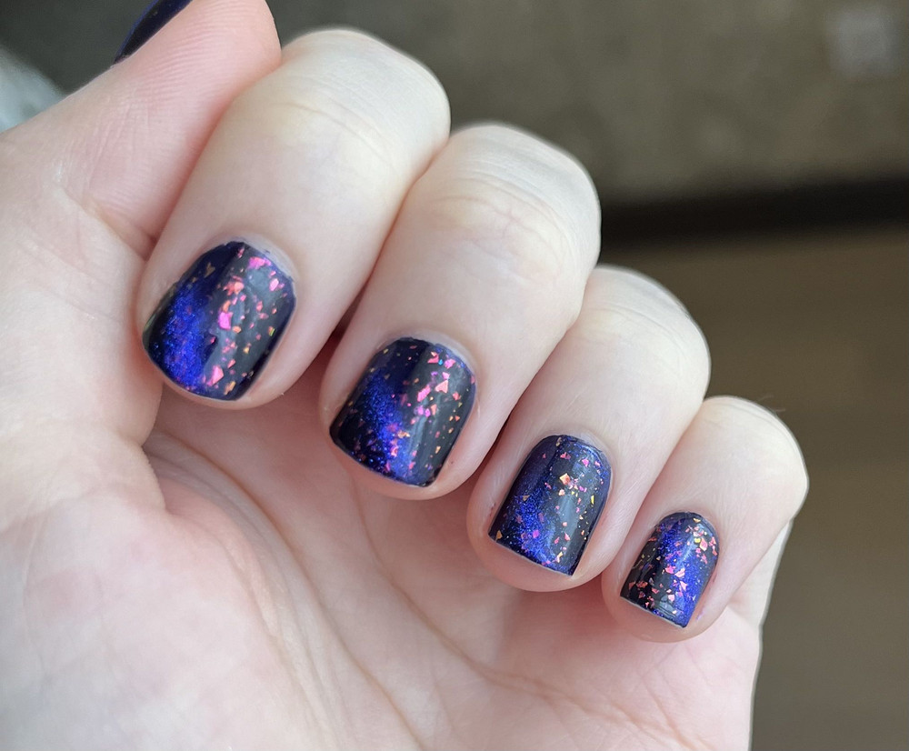 Выручила темно синяя подложка в 2 слоя и топ слюда... Именно за оттенок и стойкость 4 звезды...