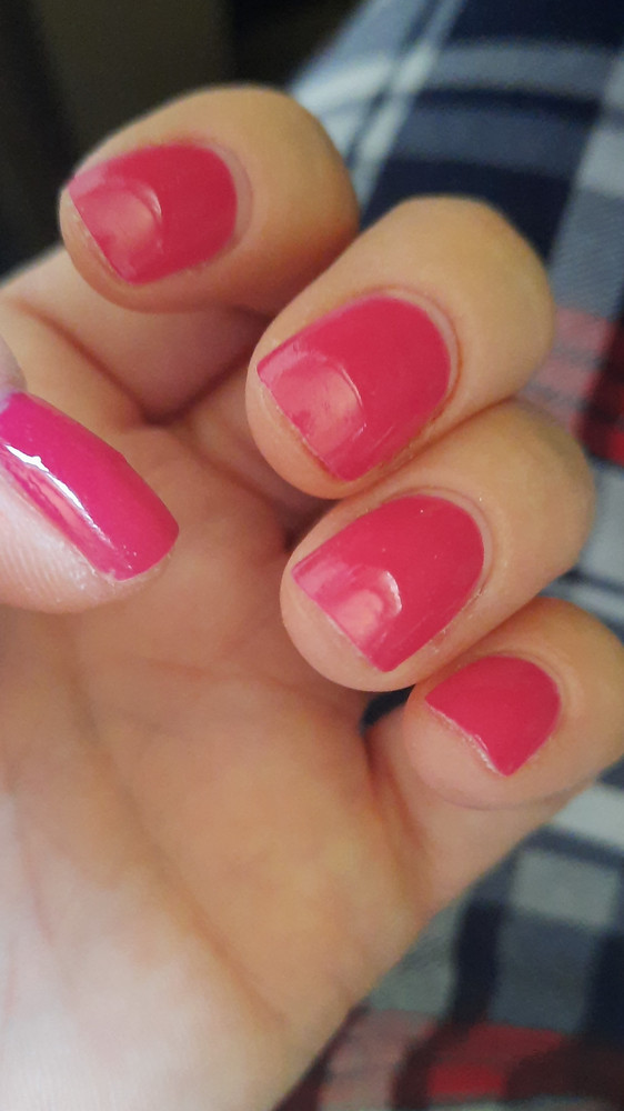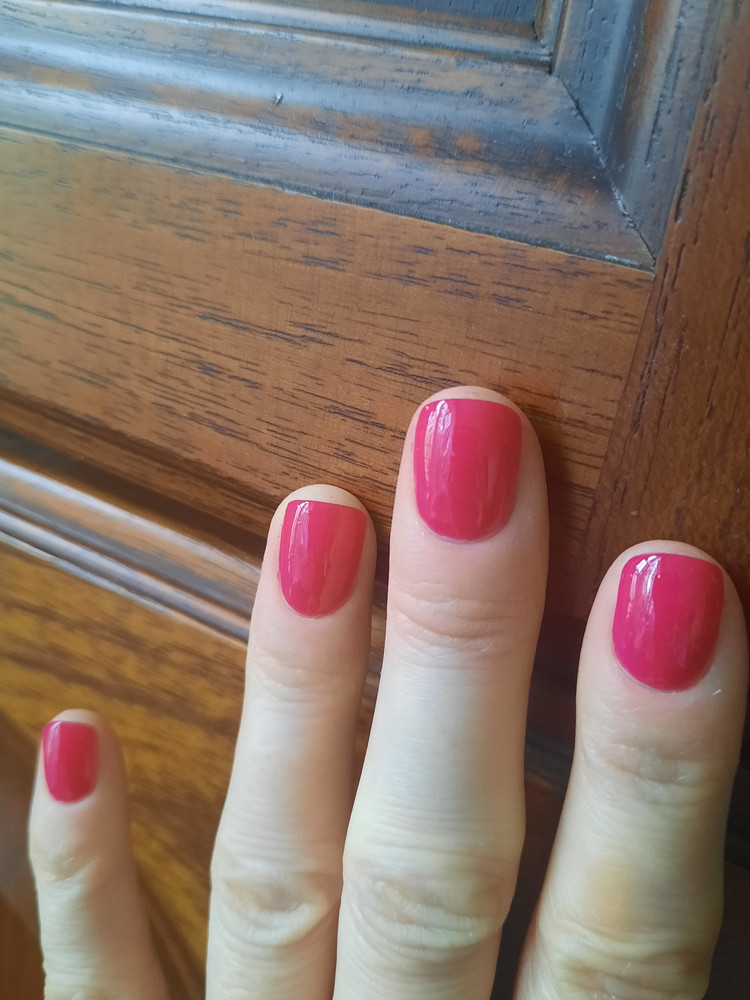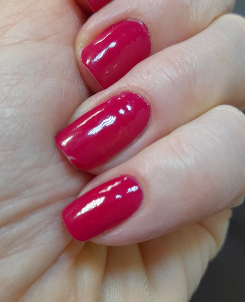 Супер лак. Цвет чистый, между красным и малиной. Ложится отлично, за кутикулу не затекает. Даже новичок накрасит с закрытыми глазами. На 6 день затерлись кончики, сколов и паутины совсем нет. Лак накрашен в 2 слоя+топ. Конечно рекомендую.1 фото ,только накрасила, 2 фото 6 день. Цвет немного отличается от заявленного.