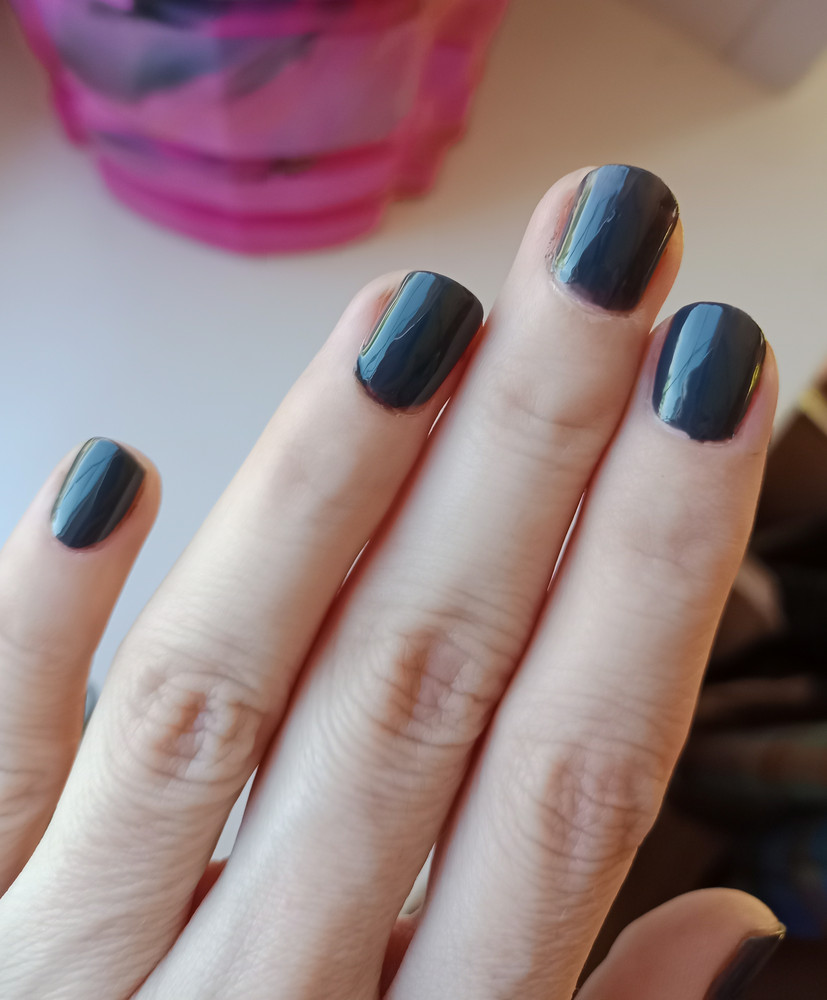Снимается жидкостью для снятия лака. На фото лак нанесен в два слоя и покрыт топом.