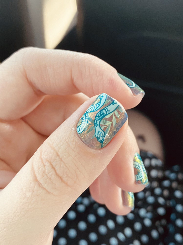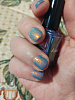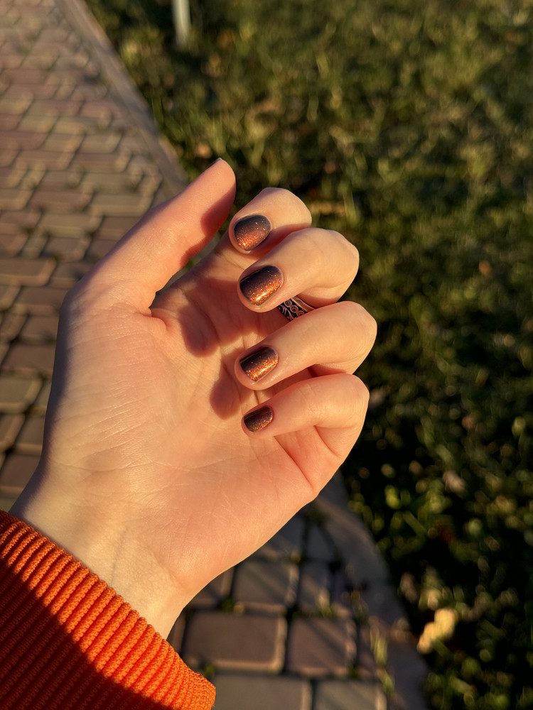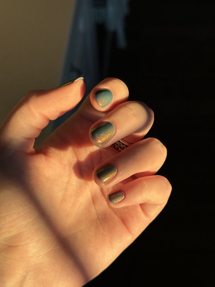 Мне очень понравился лак ❤️ Просто любовь! В жизни он красевее, чем на фото: мало того, что шиммер под разным освещением и углом отшивает, то зеленым, то золотым, то розовым; так еще от температуры база меняет свой цвет
